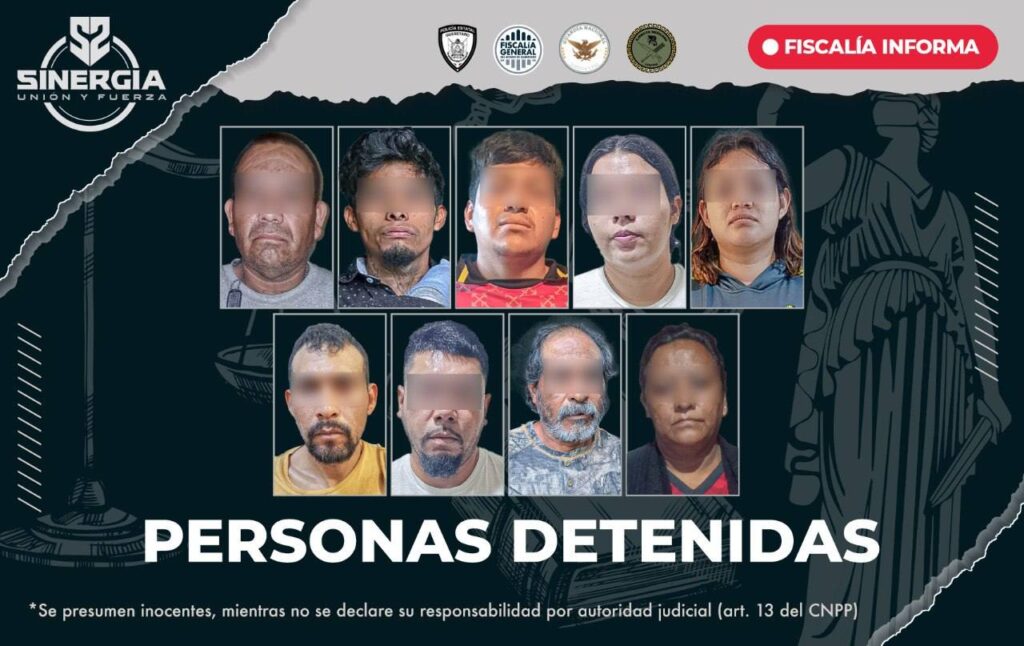 La Fiscalía General del Estado ejecutó operativos de cateo en 9 inmuebles distribuidos en los municipios de Cadereyta de Montes, Colón, Landa de Matamoros y Arroyo Seco, resultando en la detención de 9 personas como probables autores de delitos contra la salud y violación a la Ley Federal de Armas de Fuego.