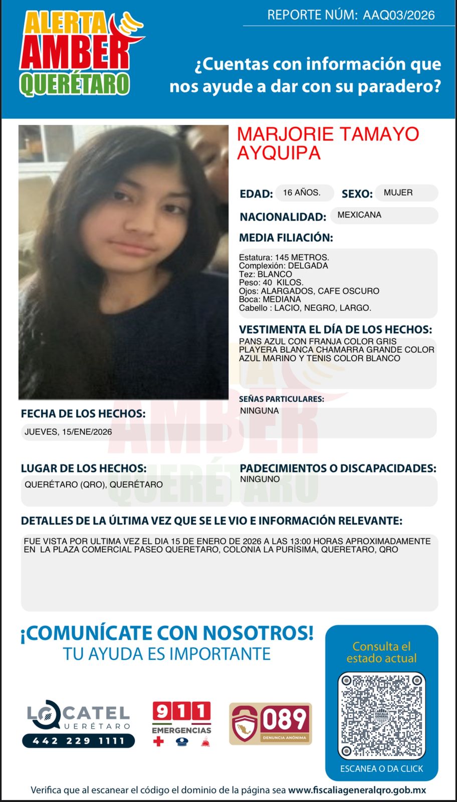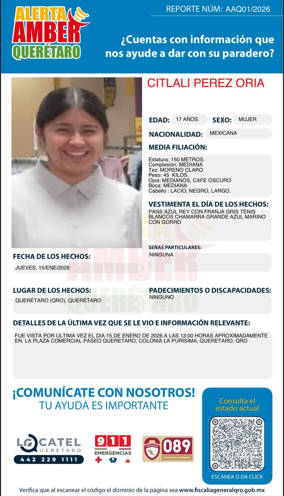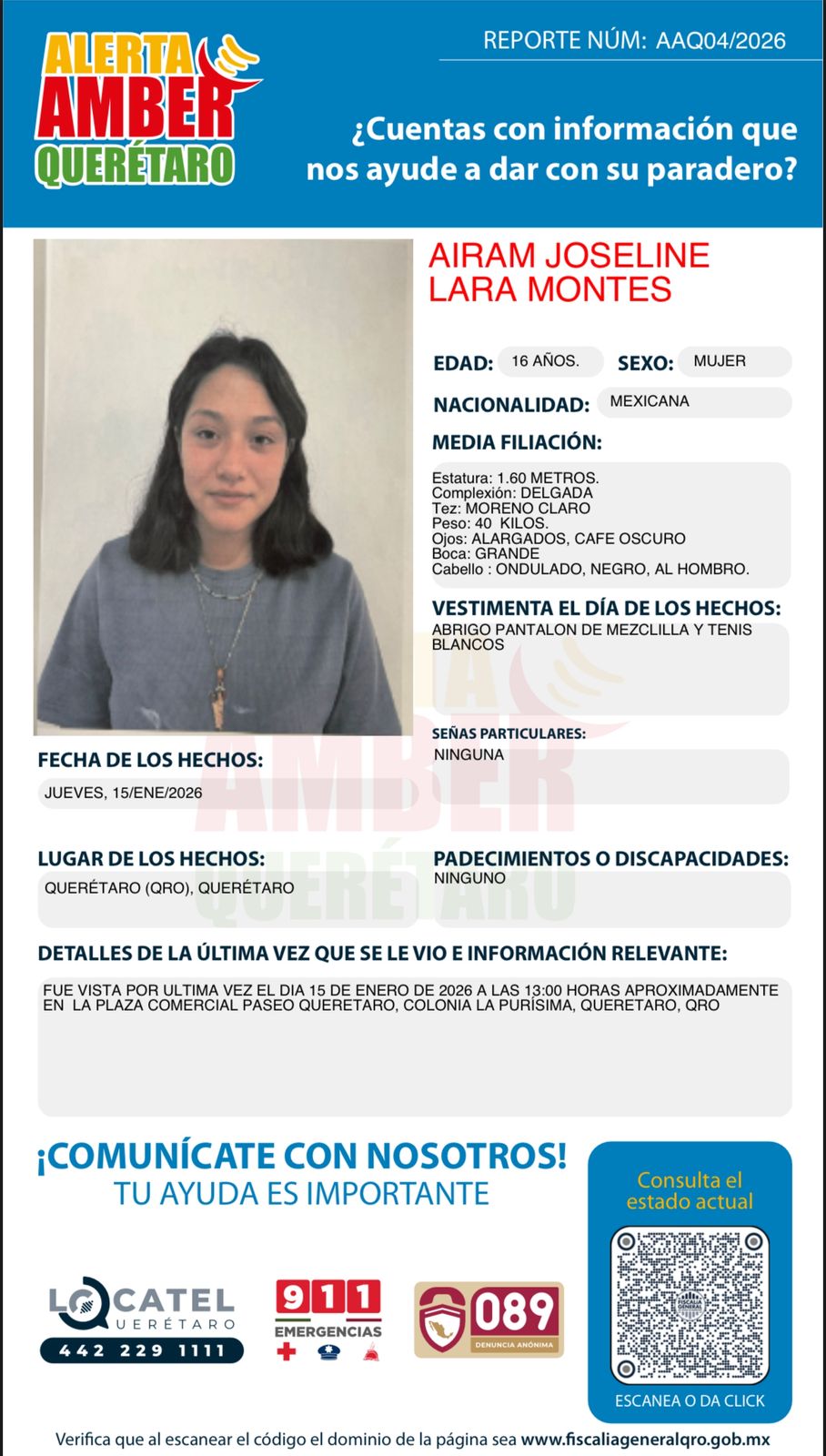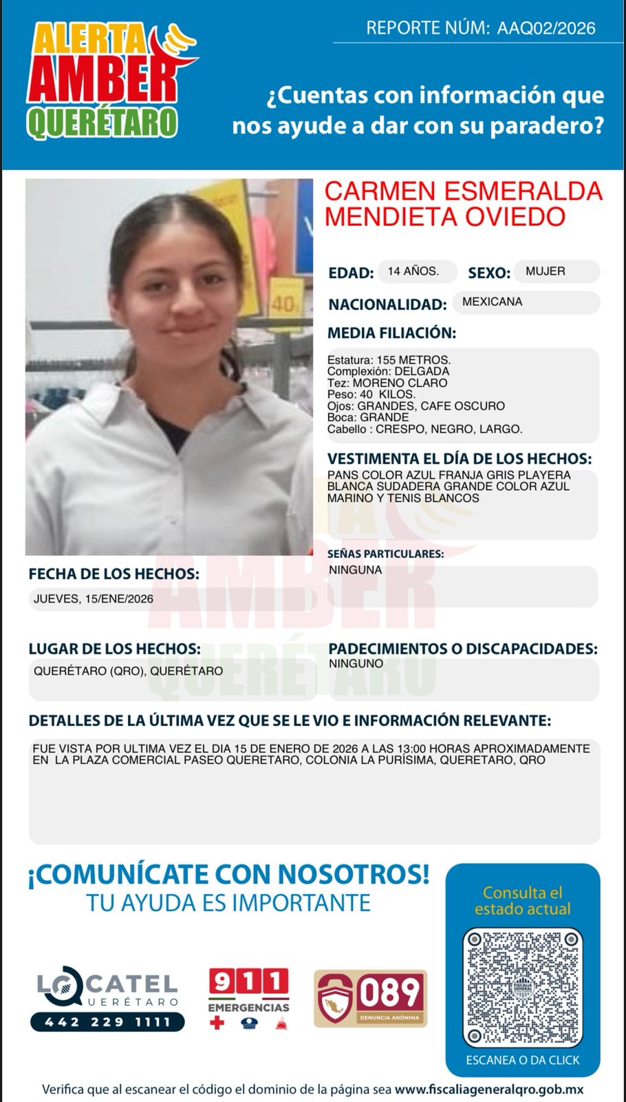 Fiscalía de Querétaro solicita apoyo ciudadano: Alerta AMBER