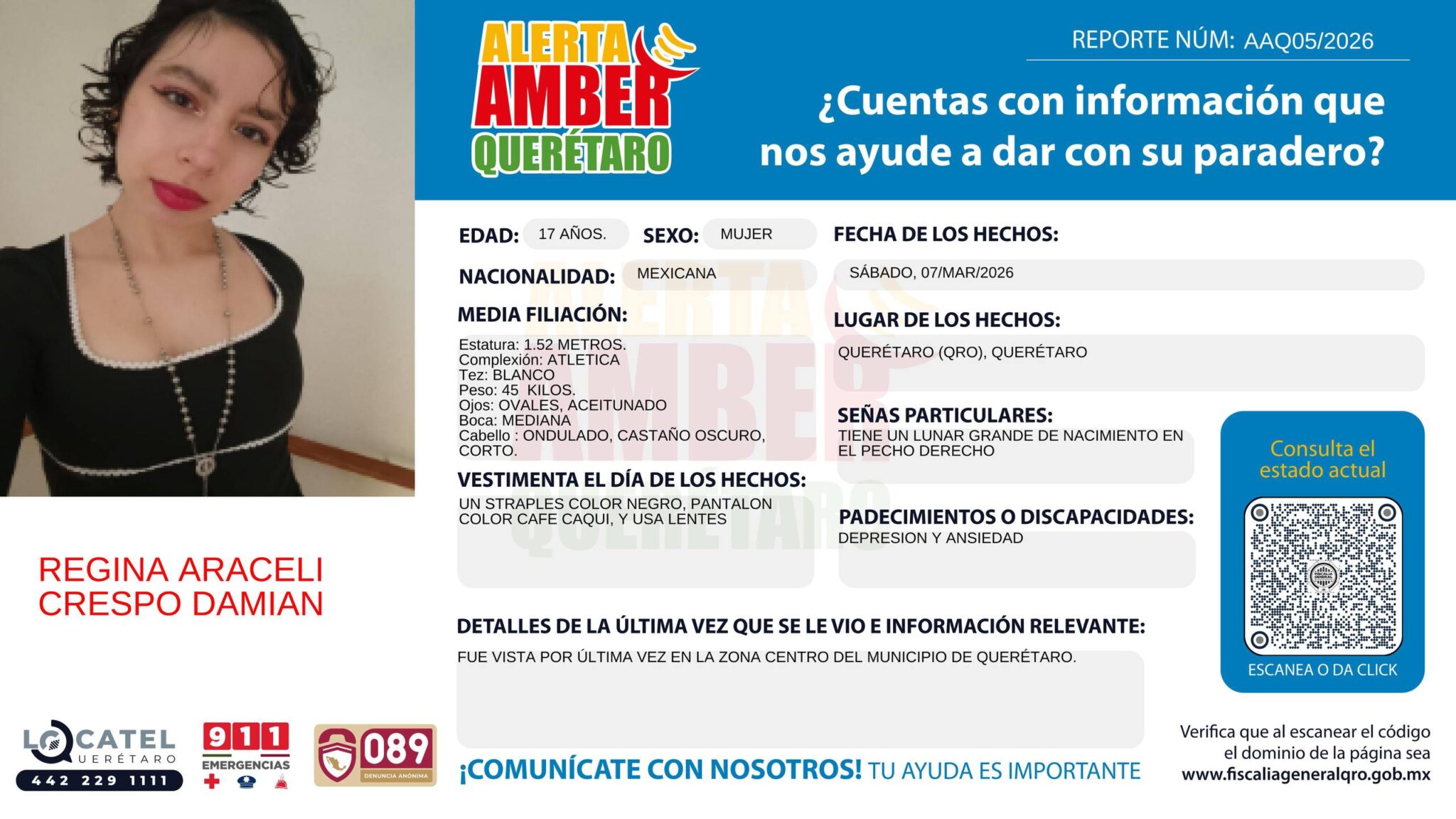 #AlertaAMBER | Hacemos una convocatoria de colaboración a la ciudadanía, para la búsqueda y localización de REGINA ARACELI CRESPO DAMIAN. ¿Cuentas con información que nos ayude para localizarla? Comunícate a Locatel al 442 229 111, al número de emergencias al 911 y de manera anónima al 089. #Conectar #QueLaRedNosAcerque #ParaQueNadieHagaFalta